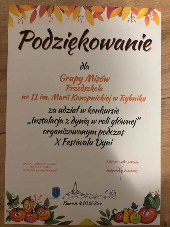 Nasze przedszkole wzięło udział w X Festiwalu Dynii organizowanym w Rybniku - Kamieniu. Grupa "Misie" i "Smoki" przygotowała niezwykłe instalacje z dynią w roli głównej. Mnóstwo czasu, ogrom pracy i przede wszystkim zaangażowanie Rodziców oraz Pań pracujących w tych grupach - należą się wszystkim ogromne brawa i słowa podziękowania!