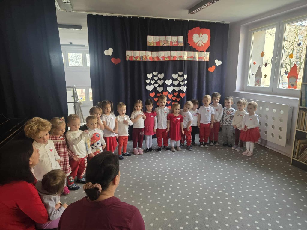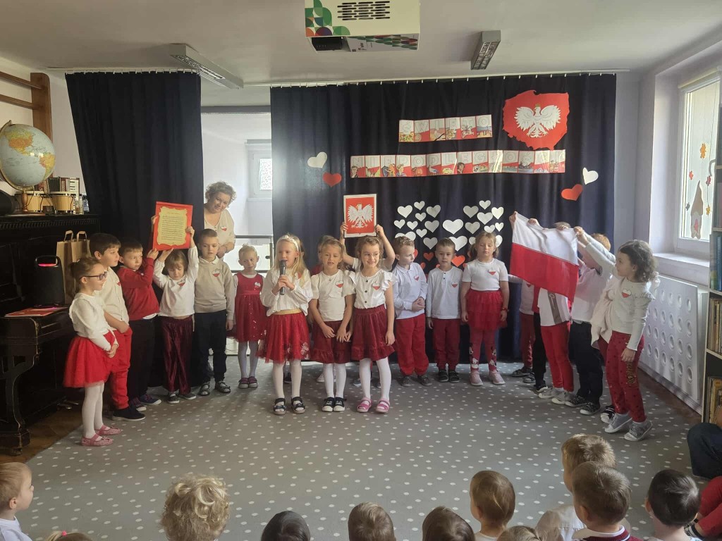 Dzieci z dumą zaprezentowały swoje umiejętności w galowych strojach, a sala przedszkolna została udekorowana barwami narodowymi.