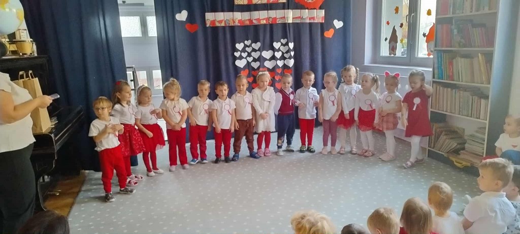 Przedszkolaki zaprezentowały program artystyczny, na który złożyły się: recytacje wierszy o tematyce patriotycznej, wspólne śpiewanie pieśni i piosenek o Polsce, pokaz taneczny z biało-czerwonymi elementami oraz krótka inscenizacja przedstawiająca drogę naszego kraju do wolności.
